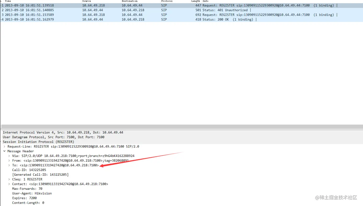 EasyCVR国标级联上级时,出现级联状态异常的现象。针对该问题我们需要做调整,所以首先来抓包排查。注册信令的抓包文件如下所示: