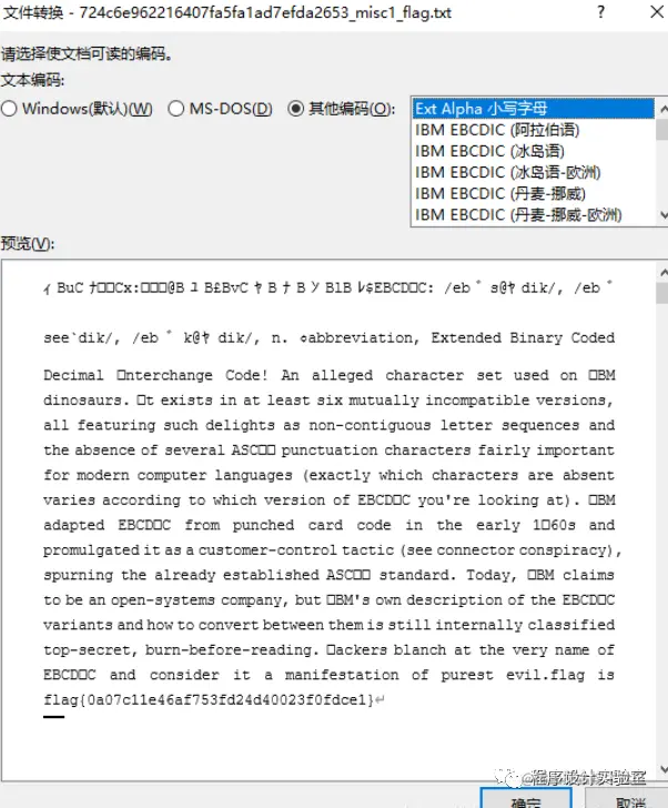 可见,Ext Alpha就是这个misc txt文本的编码格式。flag就是:flag{0a07c11e46af753fd24d40023f0fdce1}