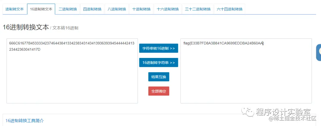 题目提示「Base64÷4」,但base64解码解不出来,base16也解不出,猜测16进制hex转字符串,成功解出flag
