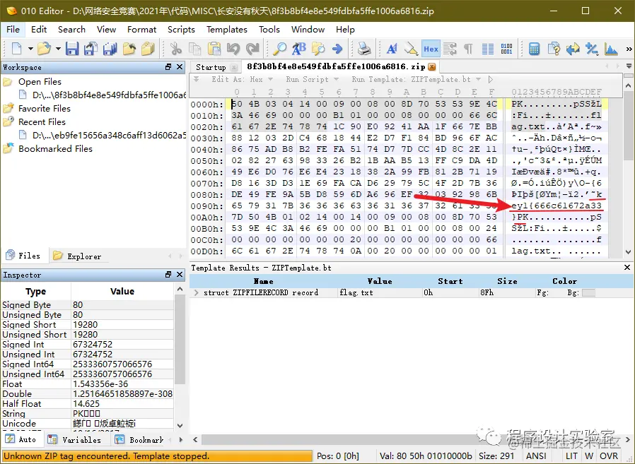 联想到刚才打开压缩包的时候提示损坏,那这个压缩包应该还暗藏什么玄机,用010 editor打开看看~ 果然藏了点私货在里面
