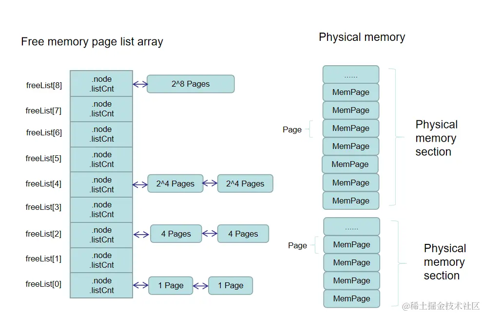 上面提到了伙伴算法,先看下伙伴算法的示意图,如下。每个物理内存段都分割为一个一个的内存页,空闲的内存页挂载在空闲内存页节点链表上。共有9个空闲内存页节点链表,这些链表组成链表数组。第一个链表上的内存页节点大小为1个内存页,第二个链表上的内存页节点大小为2个内存页,第三个链表上的内存页节点大小为4个内存页,依次下去,第9个链表上的内存页节点大小为2^8个内存页。申请内存、释放内存时会操作这些空闲内存页节点链表,后文详细分析。