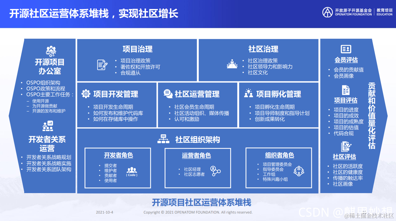 开源社区体系堆栈有非常值得深入讨论的内容,这里就不展开讨论了,后续,如果有机会,非常想和大家分享一下,开源项目办公室,这个话题。