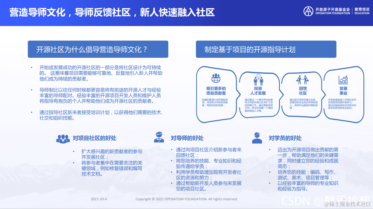 一个友善的可持续的社区,需要反复的帮助新人,并让他们成为持续的贡献者。基于这个理念,导师制是非常契合的选择,经验丰富的社区成员,协助有抱负的新人,持续成长并最终成为贡献者。