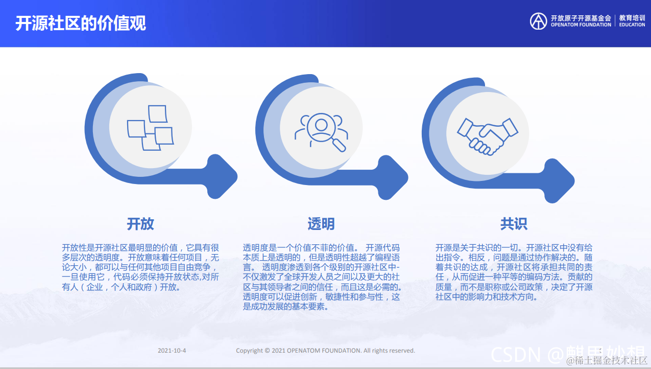 - 共识:透明度是一个价值不菲的价值。开源代码 本质上是透明的,但是透明性超越了编程语 言。透明度渗透到各个级别的开源社区中- 不仅激发了全球开发人员之间以及更大的社 区与其领导者之间的信任,而且这是必需的。透明度可以促进创新,敏捷性和参与性,这 是成功发展的基本要素。