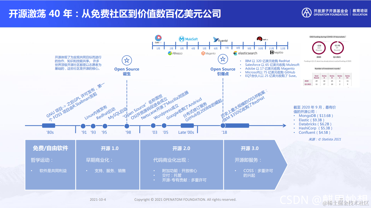 随着软件、互联网行业的高速发展,我们的开源也从R.Stallman最开始倡导的哲学运动,历经早期商业化,代码商业化到现在的开源商业化。而在这几十年里,成长了一批开源企业,以redhat为例,开源公司已经可以达到数百亿市值了。