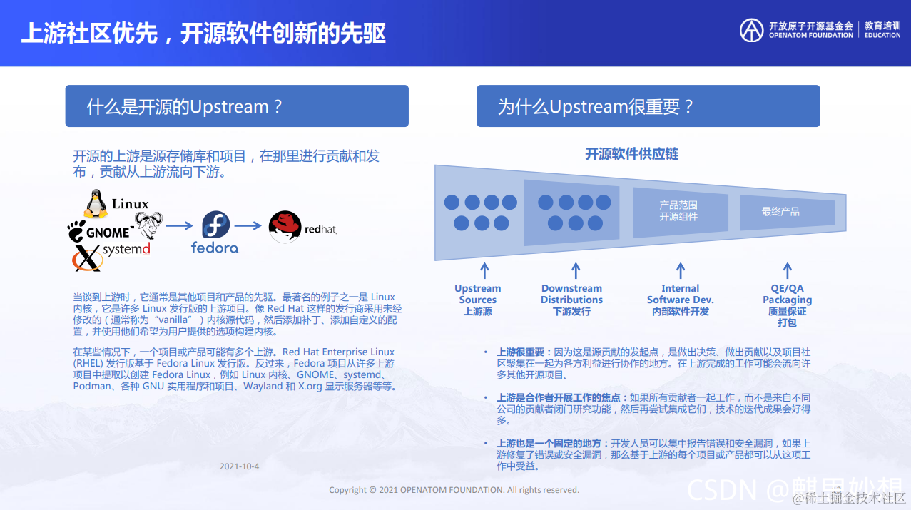 说到社区发展,其实我最想说的,就是这部分了, 上游社区优先,这也是对开源之道的直观体现。上游具有风险和勇敢精神的进行了开源,作为下游必须感恩,并且遵循公平价值回报。这样才可以让社区真正的健康,良性发展。