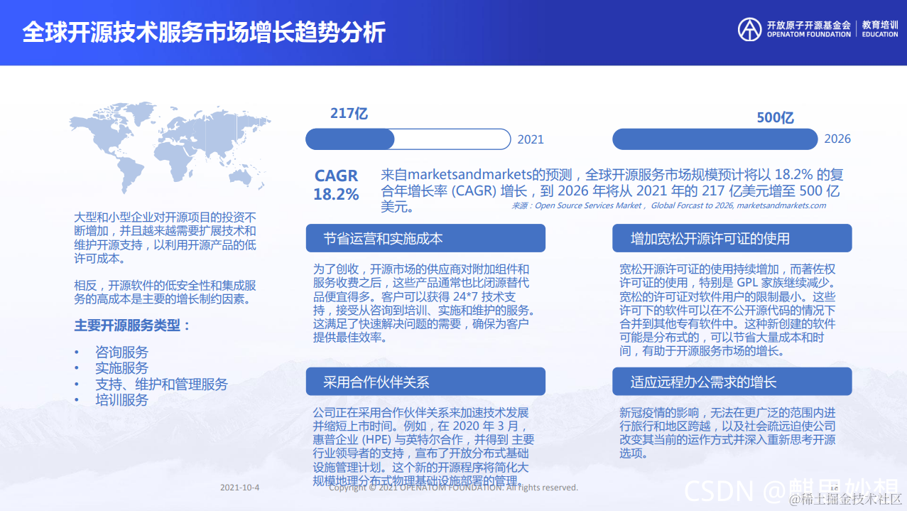 根据marketsandmarkets预测,全球开源服务市场规模预计将以18.2%的符合增长率增长,到206年将从2021年的217亿美元增至500亿美元,所以这里充满了机会。