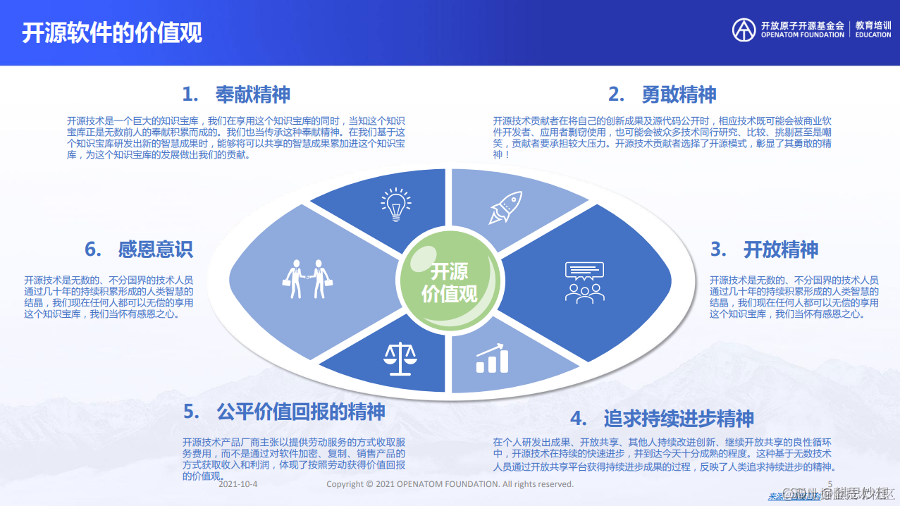 - 追求持续进步精神:初始贡献者研发出成果,开放共享,后续人员持续改进、创新,继续开放共享的良性循环,反映了人类持续进步的精神。
