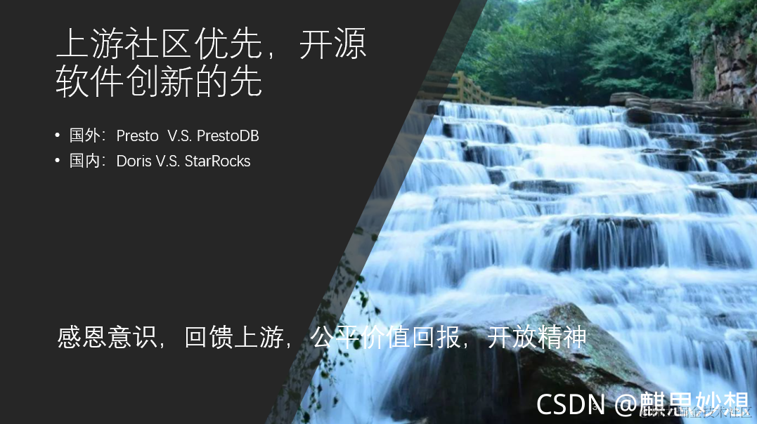 另外一点,也是今晚郭老师着重强调的“上游社区优先,开源软件创新的先”。就在前不久,闹的沸沸扬扬的国内Doris社区的分裂,以及前两年国外presto社区的分裂,我今天不想讨论谁对谁错的问题,而是想说,如果我们的开发者,都更尊重上游,更懂得感恩和开源精神,也许,这一切本可以是避免的。