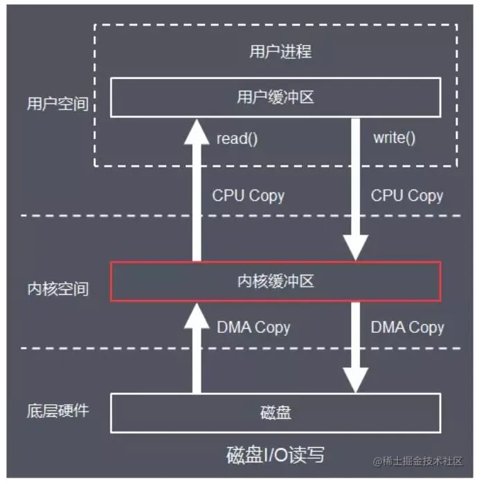 基于传统的 I/O 写入方式,write() 系统调用会触发 2 次上下文切换,1 次 CPU 拷贝和 1 次 DMA 拷贝。