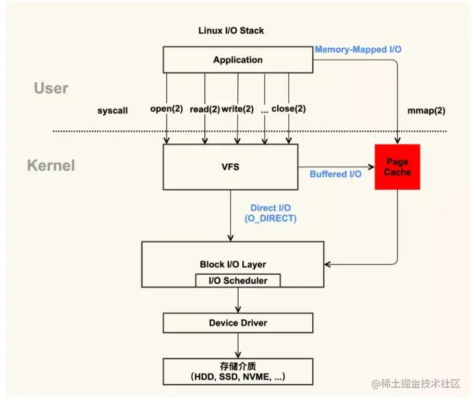 这下一目了然了吧?传统的 Buffered IO 使用 read 读取文件的过程什么样的?假设要去读一个冷文件(Cache 中不存在),open 打开文件内核后建立了一系列的数据结构,接下来调用 read,到达文件系统这一层,发现 Page Cache 中不存在该位置的磁盘映射,然后创建相应的 Page Cache 并和相关的扇区关联。然后请求继续到达块设备层,在 IO 队列里排队,接受一系列的调度后到达设备驱动层,此时一般使用 DMA 方式读取相应的磁盘扇区到 Cache 中,然后 read 拷贝数据到用户提供的用户态 buffer 中去(read 的参数指出的)。