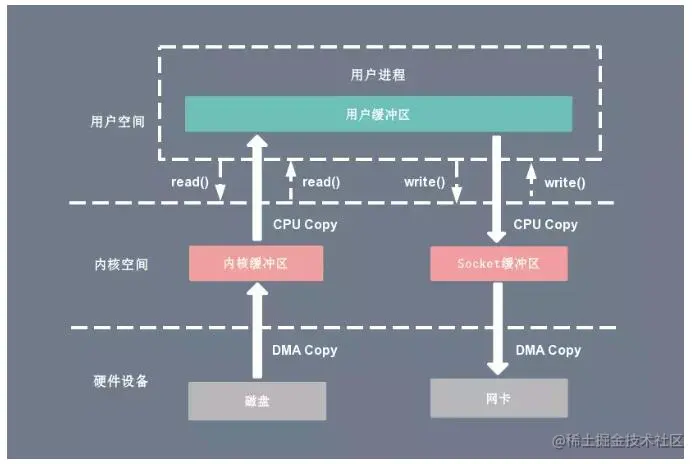 在 Linux 系统中,传统的访问方式是通过 write() 和 read() 两个系统调用实现的,通过 read() 函数读取文件到到缓存区中,然后通过 write() 方法把缓存中的数据输出到网络端口。