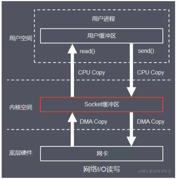 当应用程序准备好数据,执行 write 系统调用发送网络数据时,先将数据从用户空间的页缓存拷贝到内核空间的网络缓冲区(Socket Buffer)中,然后再将写缓存中的数据拷贝到网卡设备完成数据发送。