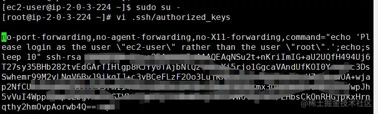 修改 ssh 登录秘钥,将 authorized_keys 内的前部分校验移除,然后以 root 重新 ssh 登录。