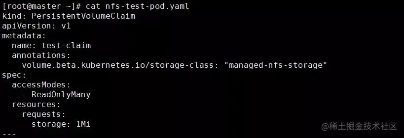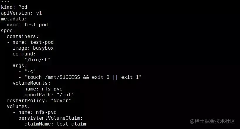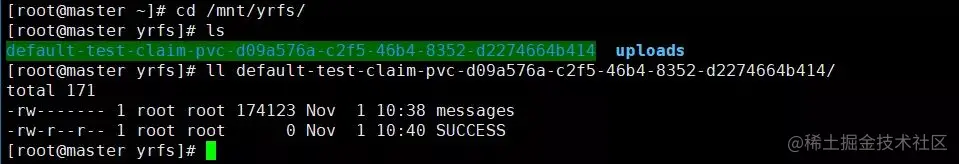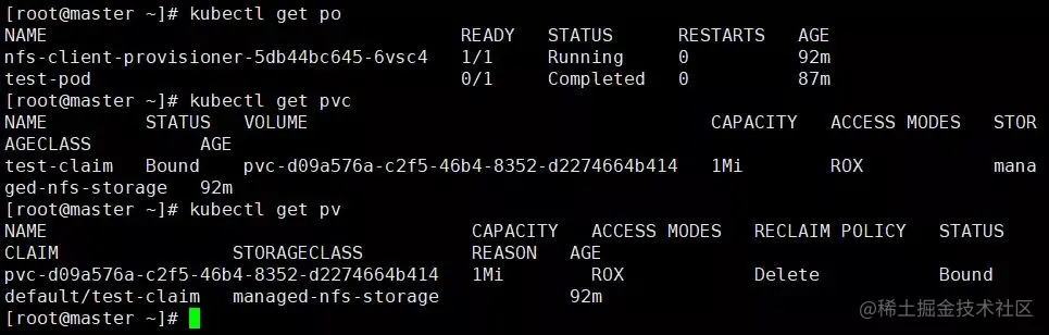 通过以上的 nfs-test-pod.yaml,我们创建了 PVC 以及 PV,并挂载到了 test-pod 内,进行的文件写入并成功。