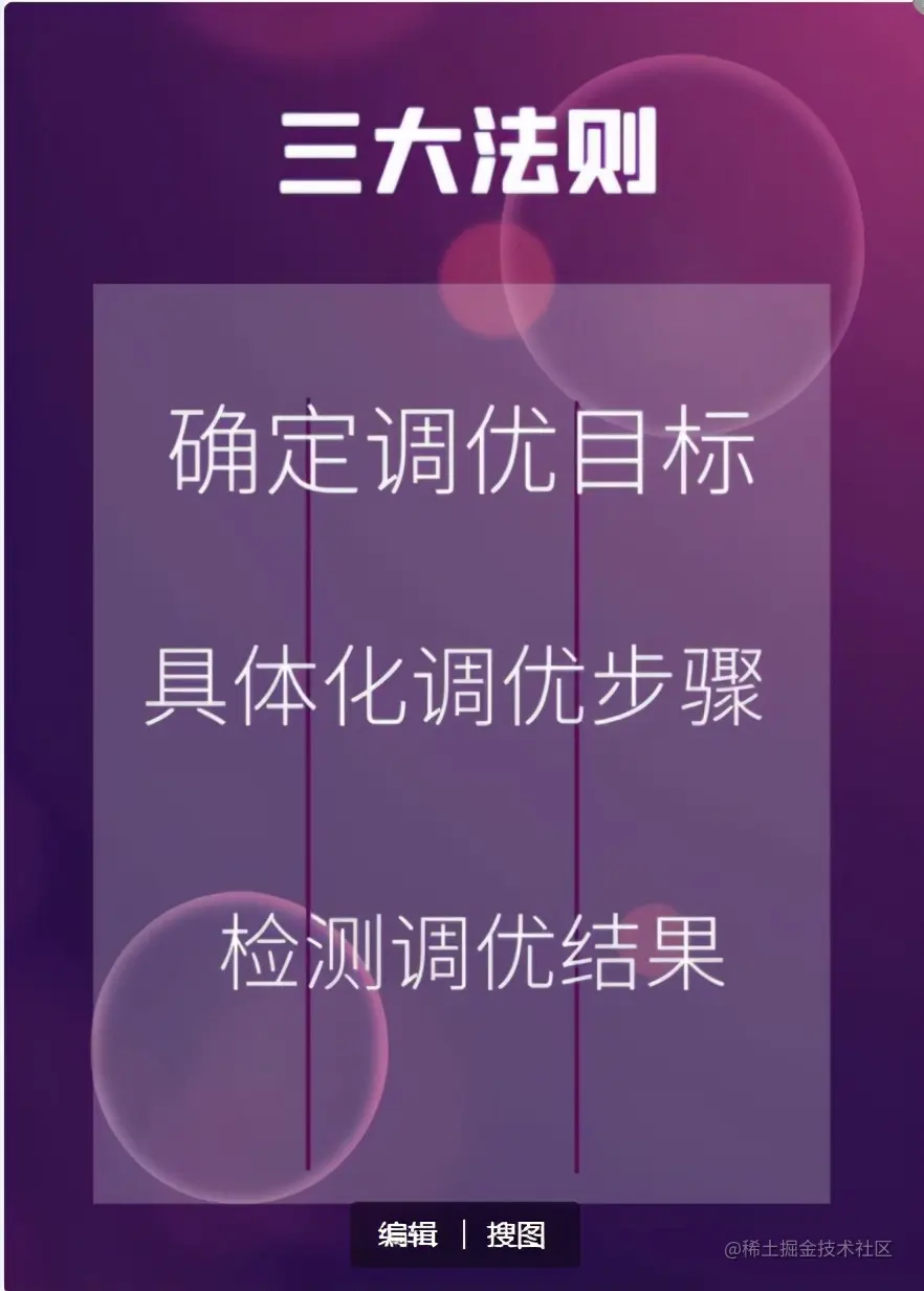 查找出问题之后我们可以通过三大法则去进行调优,首先确定调优目标,其次具体化调优步骤,最后检测调优结果。