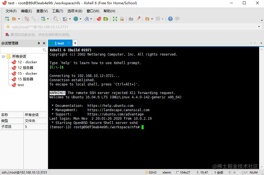 命令行ssh登录成功后就可以在X-shell中建立配置信息方便地连接了。