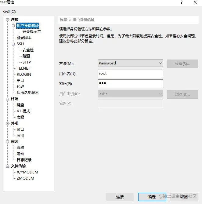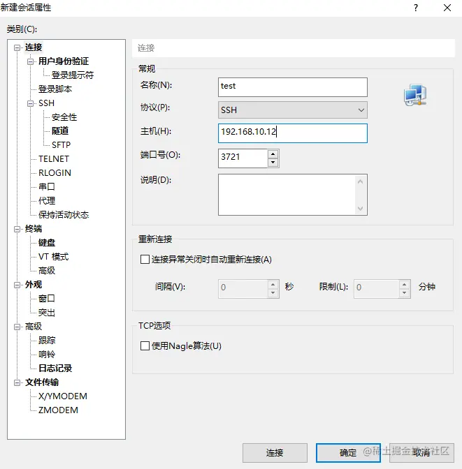 - 新建会话,填写名称、IP、端口号(我们刚刚配置过的):