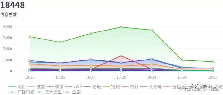 10月25日0时至10月31日23时,全网关于信创的舆情总量共18448条。传播趋势方面,前期舆情走势平稳,舆情热度在10月28日达到高峰,日声量3942条,周末热度走低。