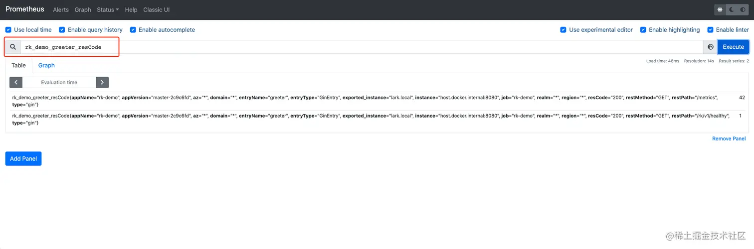 访问:localhost:9090,并且搜索 rk_demo_greeter_resCode,我们可以看到数据已经在 prometheus 里面了。