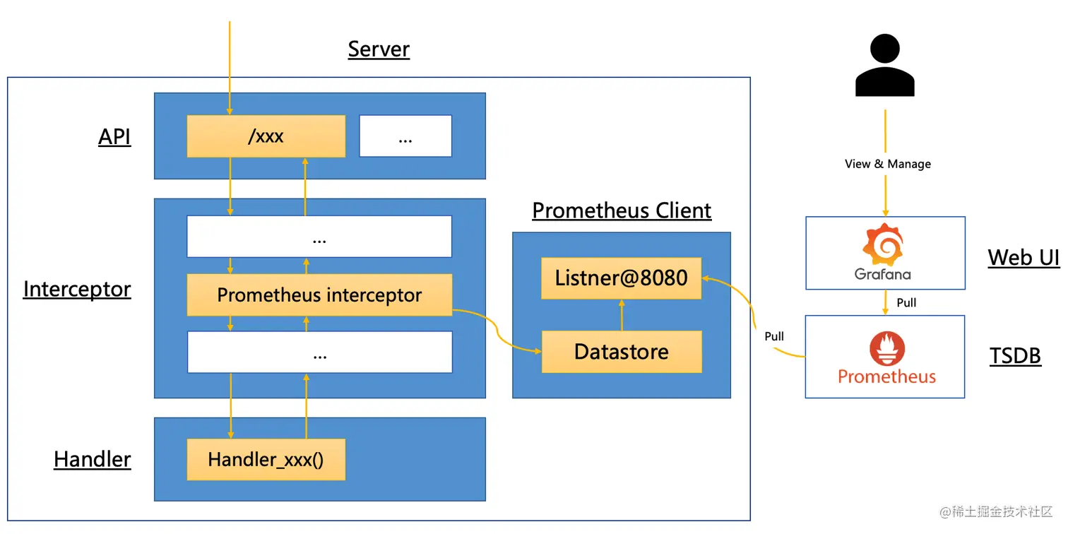 其实原理很简单,就是【劫持】API 请求,并且记录【时间】,【错误码】等信息。之后,让 Prometheus 服务主动从【创建的服务】里,拉取数据。最后,让 Grafana 服务从 Prometheus 中拉取数据,显示数据表。