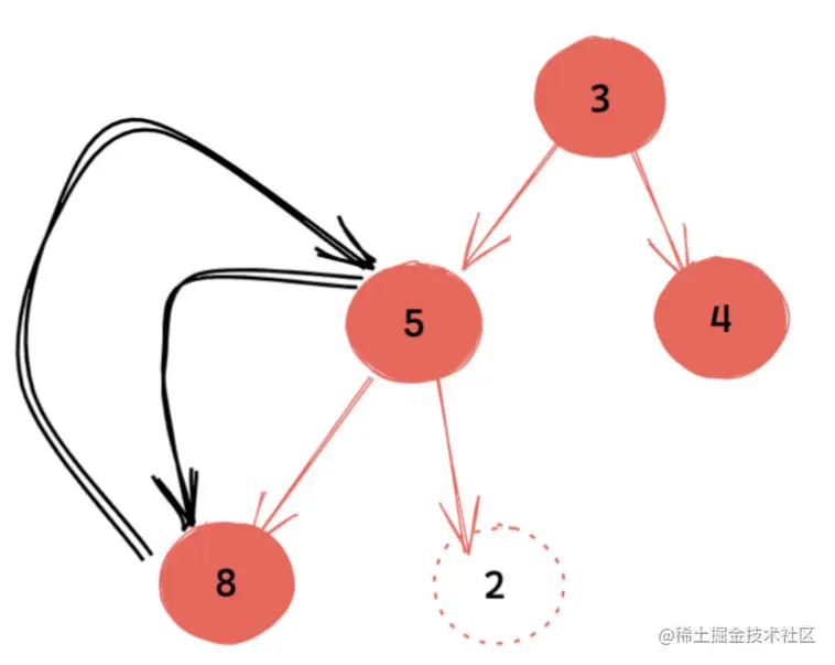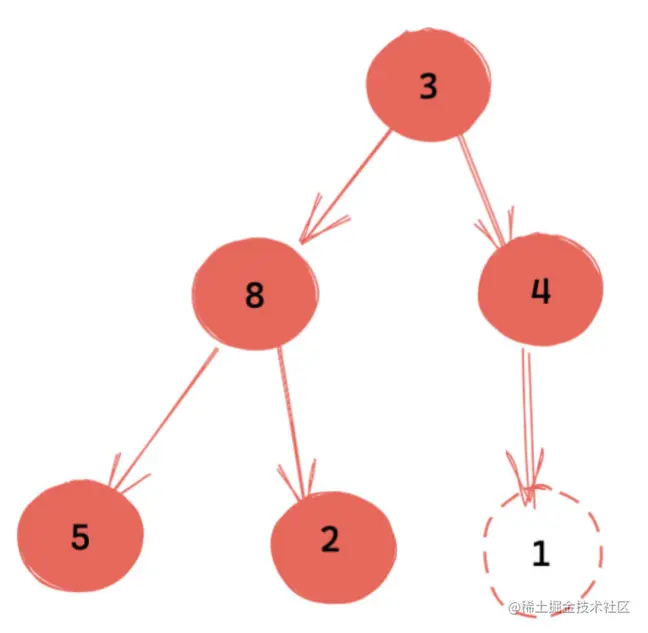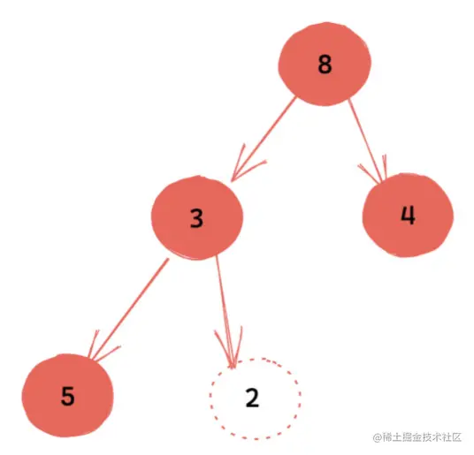 我们知道,根节点下沉过程中,有两个方向可供选择,对于小顶堆,即选择下沉到较小的节点处。这里我们需要下沉到节点3上。