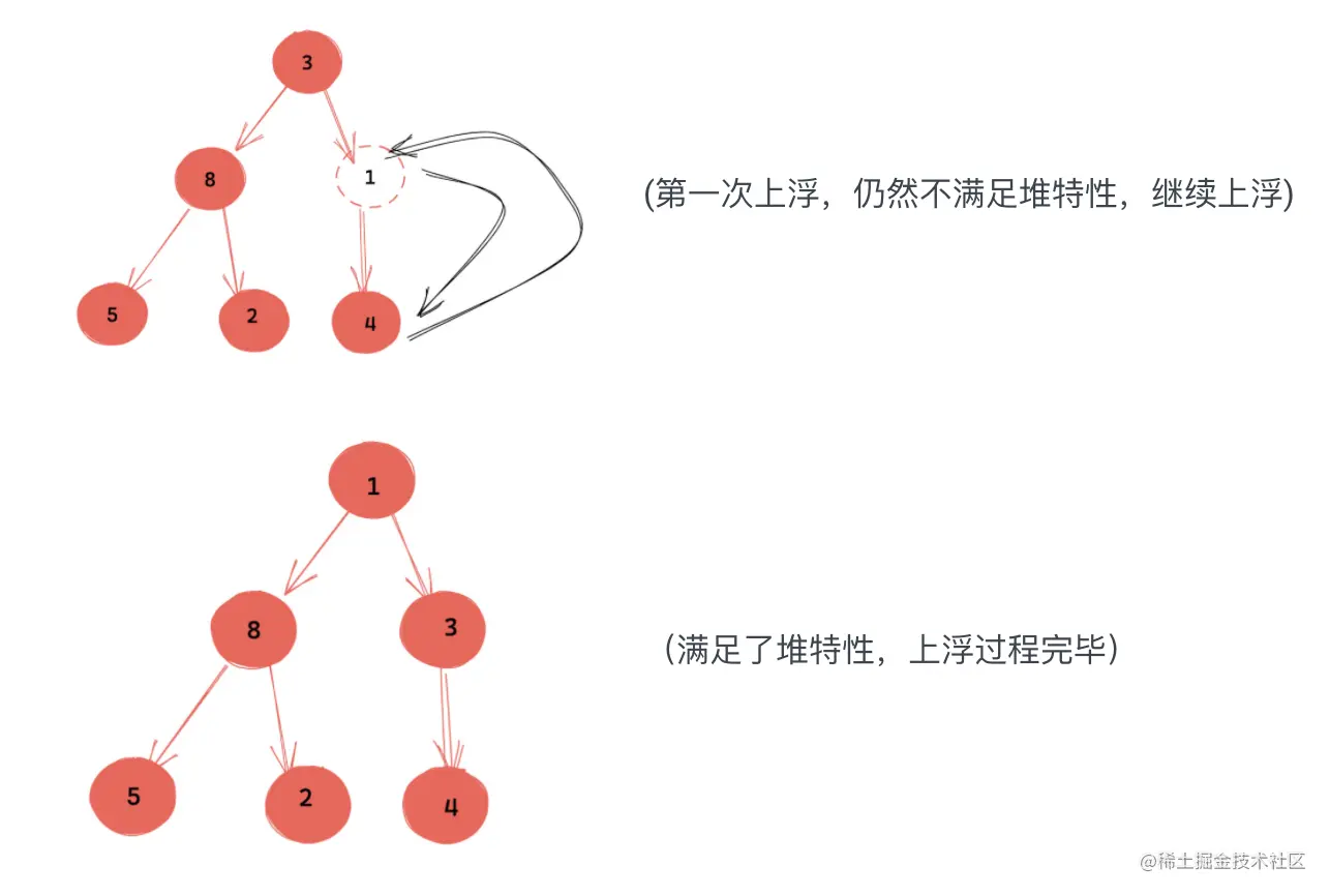 上浮操作,只需要和父节点比较,更加的简单。