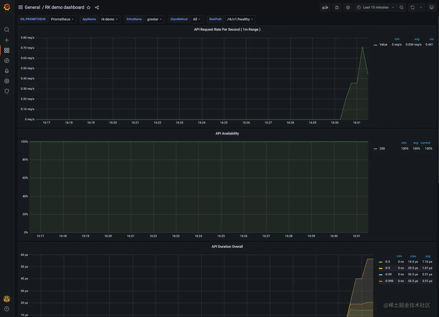 其实原理很简单,就是【劫持】API 请求,并且记录【时间】,【错误码】等信息。之后,让 Prometheus 服务主动从【创建的服务】里,拉取数据。最后,让 Grafana 服务从 Prometheus 中拉取数据,显示数据表。