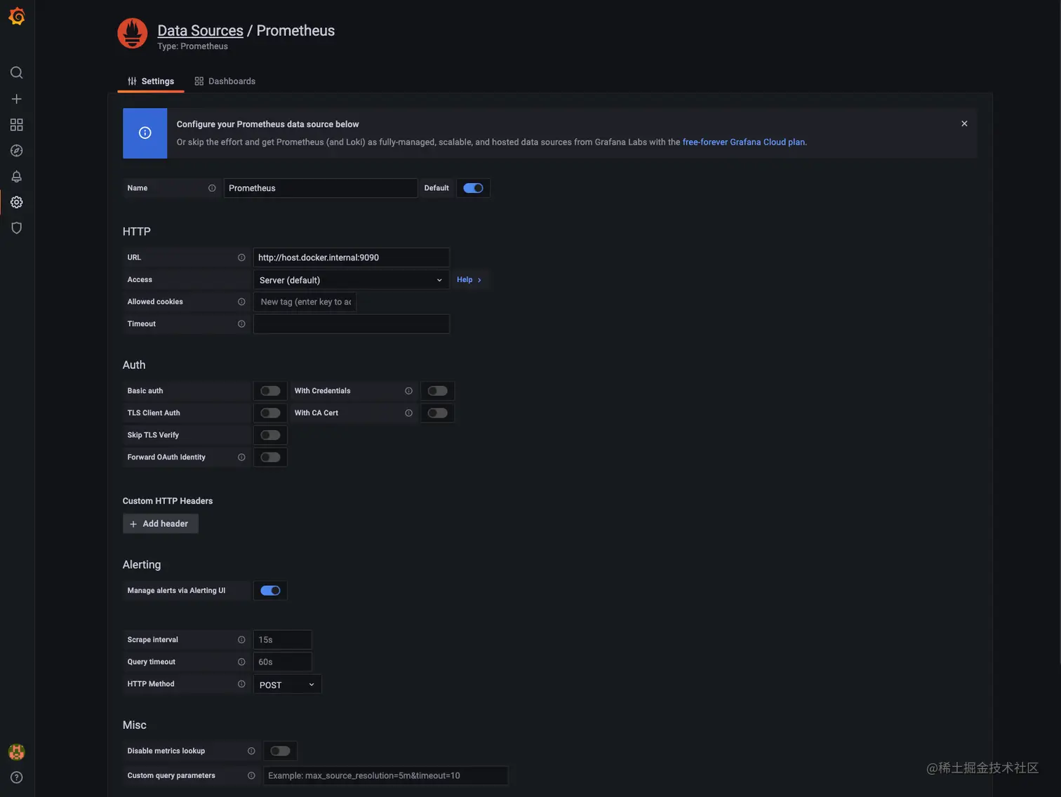 填写 Prometheus 地址,跟上面一样的道理,因为 Grafana 运行在 Docker 中,所以,我们不使用 localhost:9090,而是,host.docker.internal:9090。
