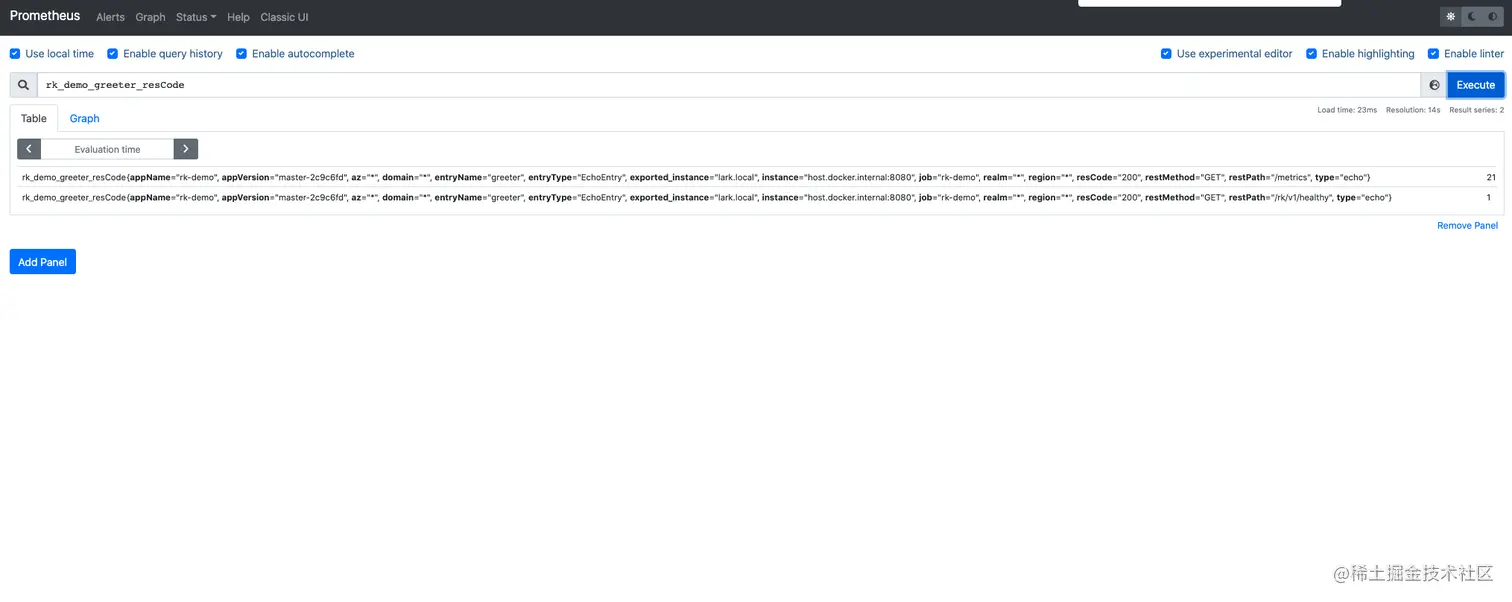 访问:localhost:9090,并且搜索 rk_demo_greeter_resCode,我们可以看到数据已经在 prometheus 里面了。