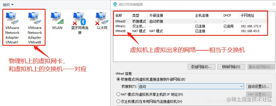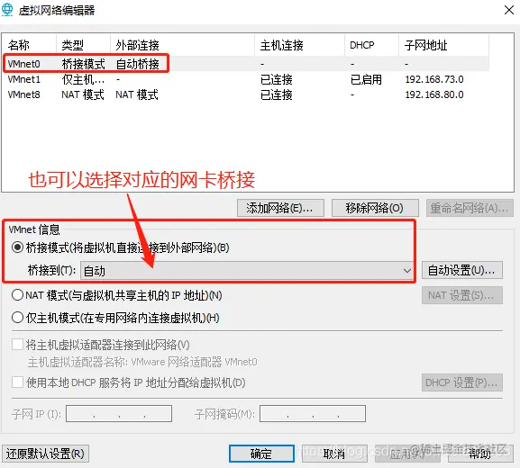 ⭐当我们安装 VMware 时,VMware 会自动为 3 种网络连接模式各自创建 1 个虚拟机网络:VMnet0(桥接模式)、VMnet8(NAT模式)、VMnet1(仅主机模式)。此外,我们也可以根据需要自行创建更多的虚拟网络。