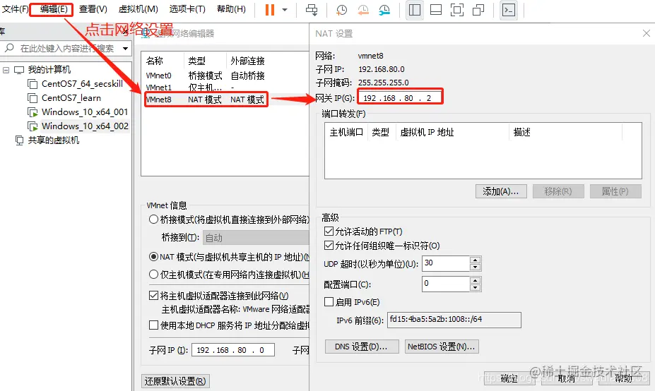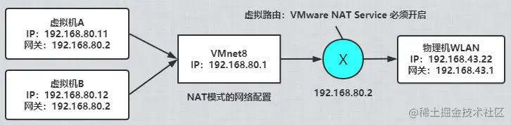 VMnet8 为 NAT 模式,VMnet8 的 IP 地址为 192.168.80.1,虚拟机 A 和虚拟机 B 是 VMnet8 网段的两个虚拟机,他们的网关为 192.168.80.2,跟虚拟机的设置一样,如图:
