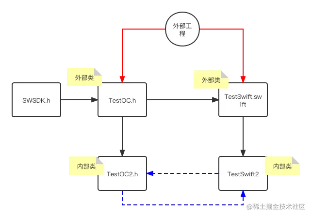 蓝色虚线:OC 与 Swift 内部类的互相调用,这也是混编最重要的工作。