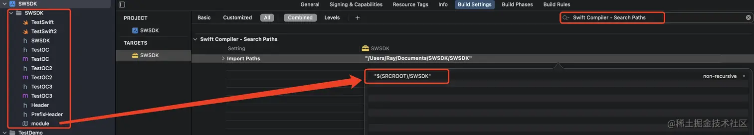 在 Building Setting 内搜索 Swift Compiler - Search Paths 后,在 Import Paths 中输入目录路径。如下图所示: