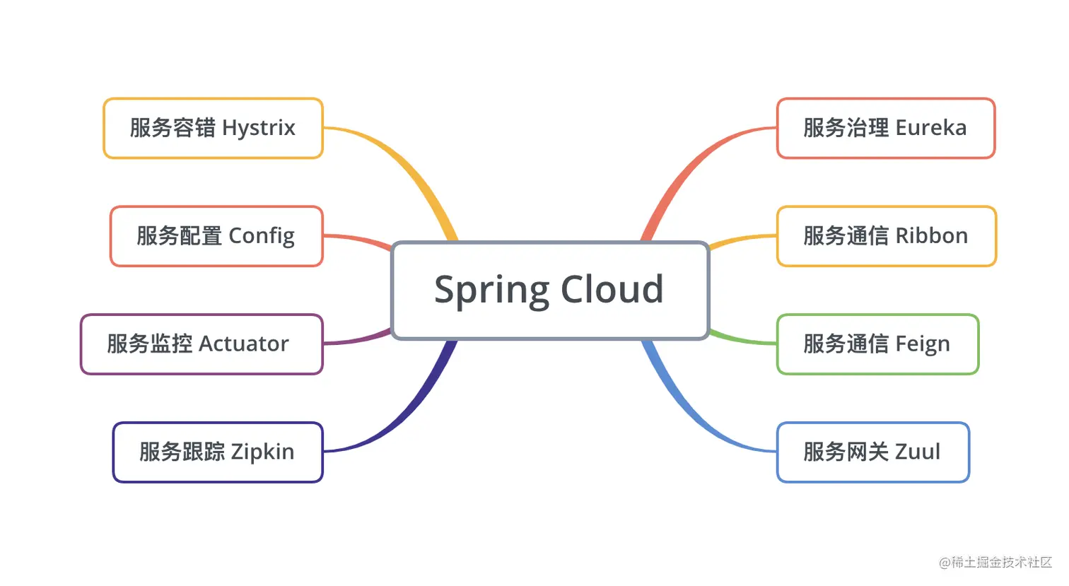 对于 Java 开发者而言,Spring 框架已成为事实上的行业标准,Spring 全家桶系列产品的优势在于功能齐全、简单好用、性能优越、文档规范,实际开发中就各方面综合因素来看,Spring Cloud 是微服务架构中非常优秀的实现方案,本课程就将为各位读者详细解读如何快速上手 Spring Cloud,Spring Cloud 的核心组件如下图所示。