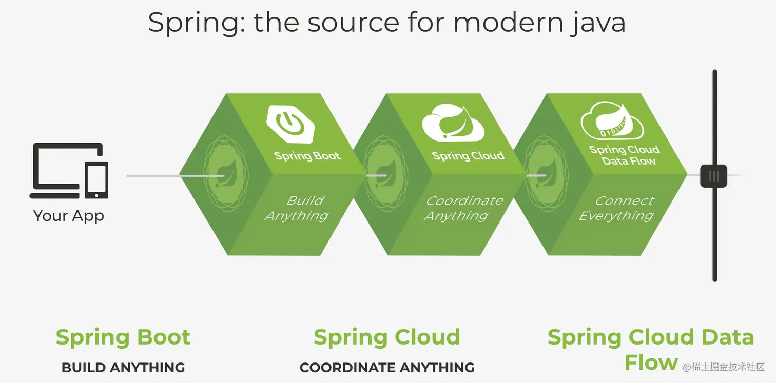 微服务是一种分布式软件架构设计方式,具体的落地框架有很多,如阿里的 Dubbo、Google 的 gRPC、新浪的 Motan、Apache 的 Thrift 等,都是基于微服务实现分布式架构的技术框架,本课程我们选择的框架的是 Spring Cloud,Spring Cloud 基于 Spring Boot 使得整体的开发、配置、部署都非常方便,可快速搭建基于微服务的分布式应用,Spring Cloud 相当于微服务各组件的集大成者,下图来自 Spring 官网。