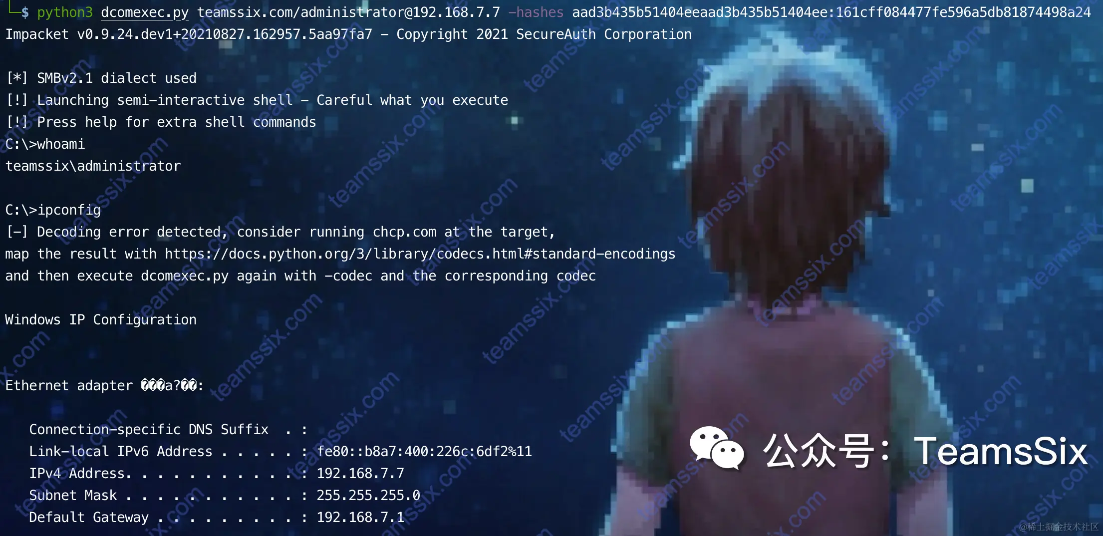 python3 dcomexec.py teamssix.com/administrator:1qaz@WSX@192.168.7.7 ipconfig