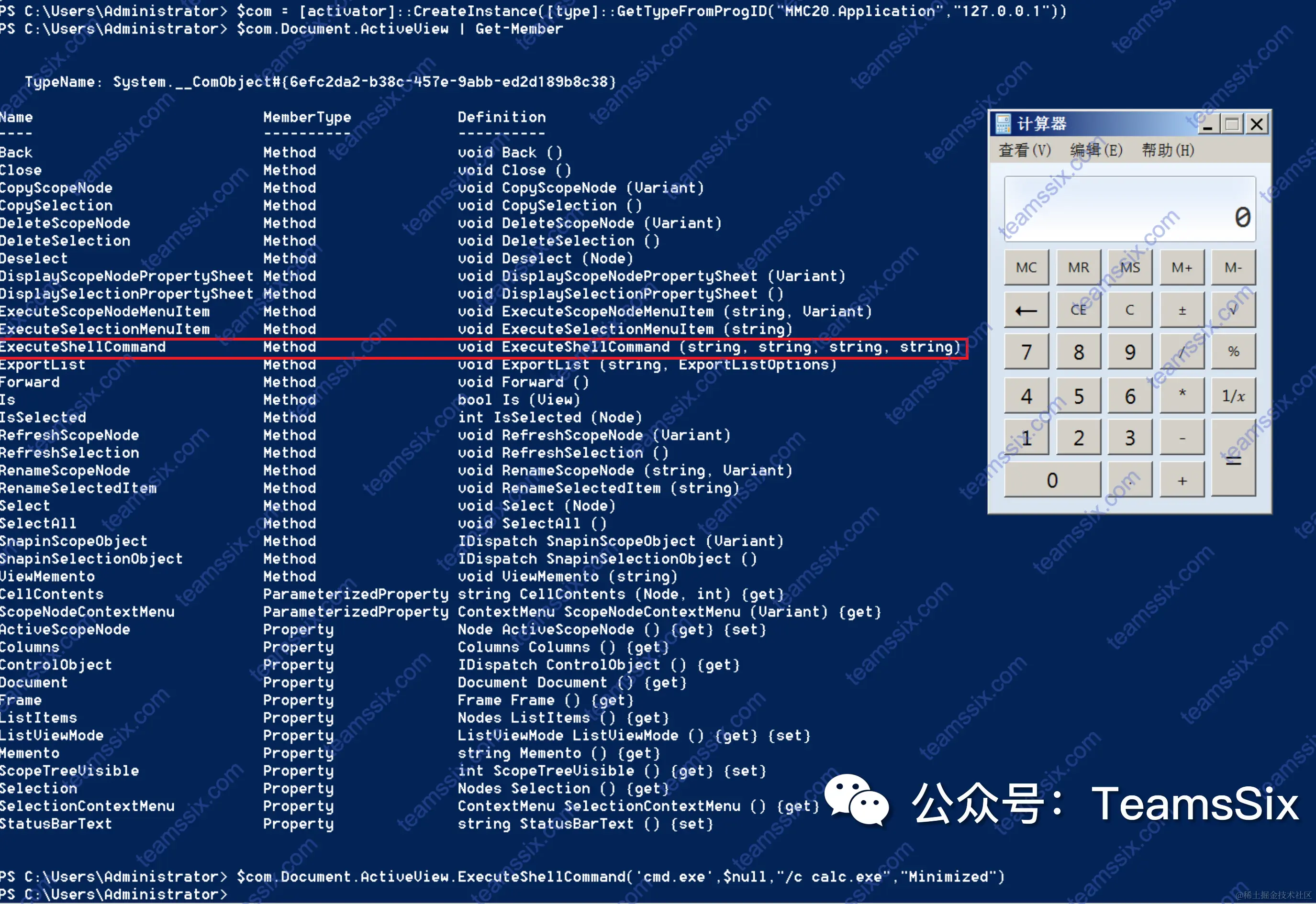 在 MMC20.Application 中有个 ExecuteShellCommand 方法,我们可以拿它来执行命令,比如启动个计算器