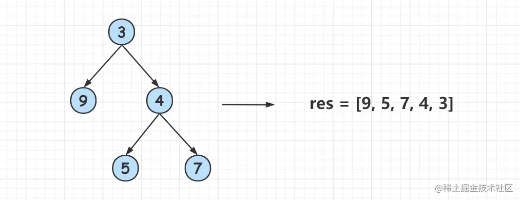 如样例所示,该二叉树的后序遍历为res = [9,5,7,4,3],下面来讲解递归的做法。