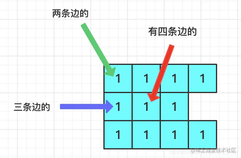 每个格子最多会有四条边和其他格子相连。在边上的格子最多有三条边。在角上的最多有两条边。无论岛屿长成什么样子,肯定是会有角的,所以最多只需删除两次。