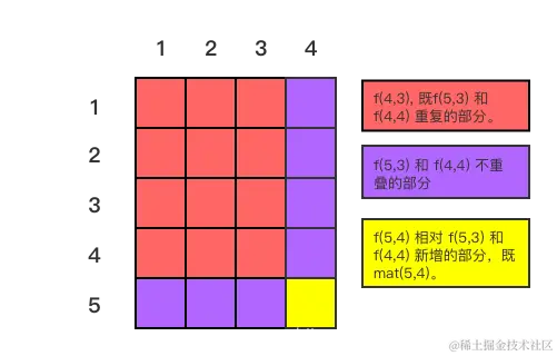 预处理部分为:设 f(x, y) 是以(x,y) 为右下角的长宽分别为 x,y 的矩形的和,那么有 f(x, y) = f(x-1, y) + f(x, y-1) - f(x-1, y-1) + mat(x, y)。如下图所示: