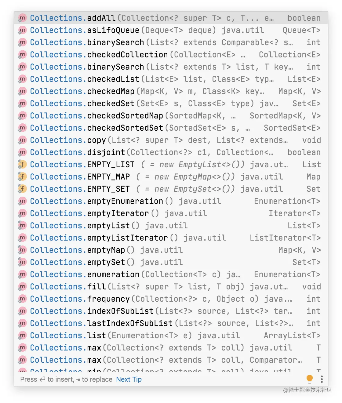 Collections 的用法很简单,在 Intellij IDEA 中敲完 Collections. 之后就可以看到它提供的方法了,大致看一下方法名和参数就能知道这个方法是干嘛的。