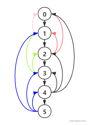 如上图所示,每个点最多会建立logn条向上的边。以寻找结点5的第5个祖先为例,可以转化为寻找结点1的第1个祖先,再转化为寻找结点0个第0个祖先,即结点0。