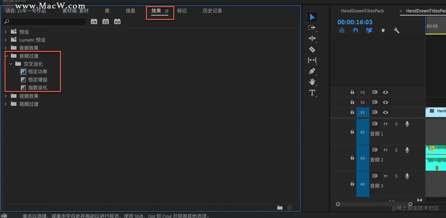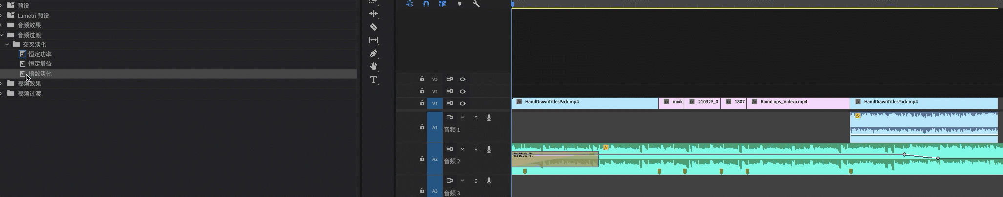 打开Premiere,点击项目-效果-音频效果,在音频过渡中可以看到有三种效果,Premiere的默认转场效果是恒定功率