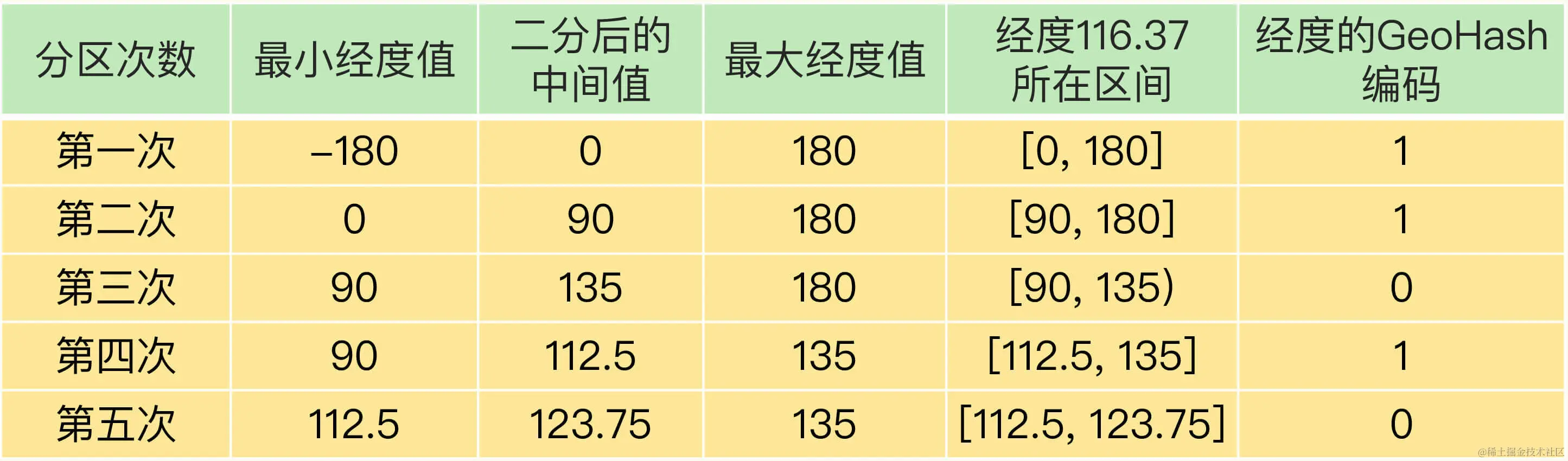GeoHash 编码会把一个经度值编码成一个 N 位的二进制值,我们来对经度范围[-180,180]做 N 次的二分区操作\