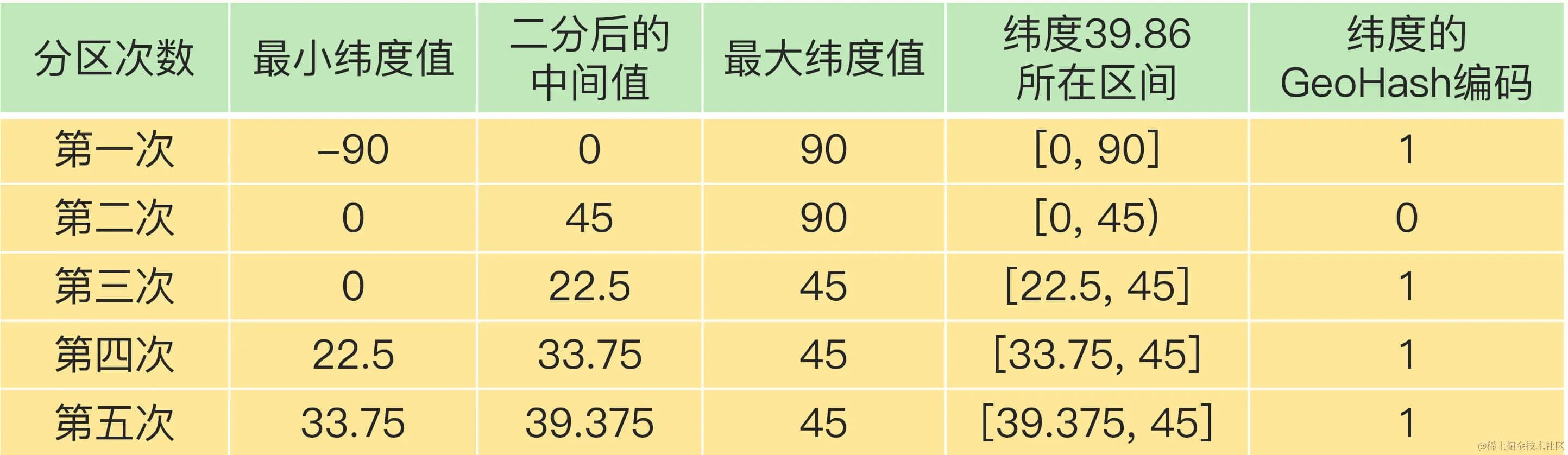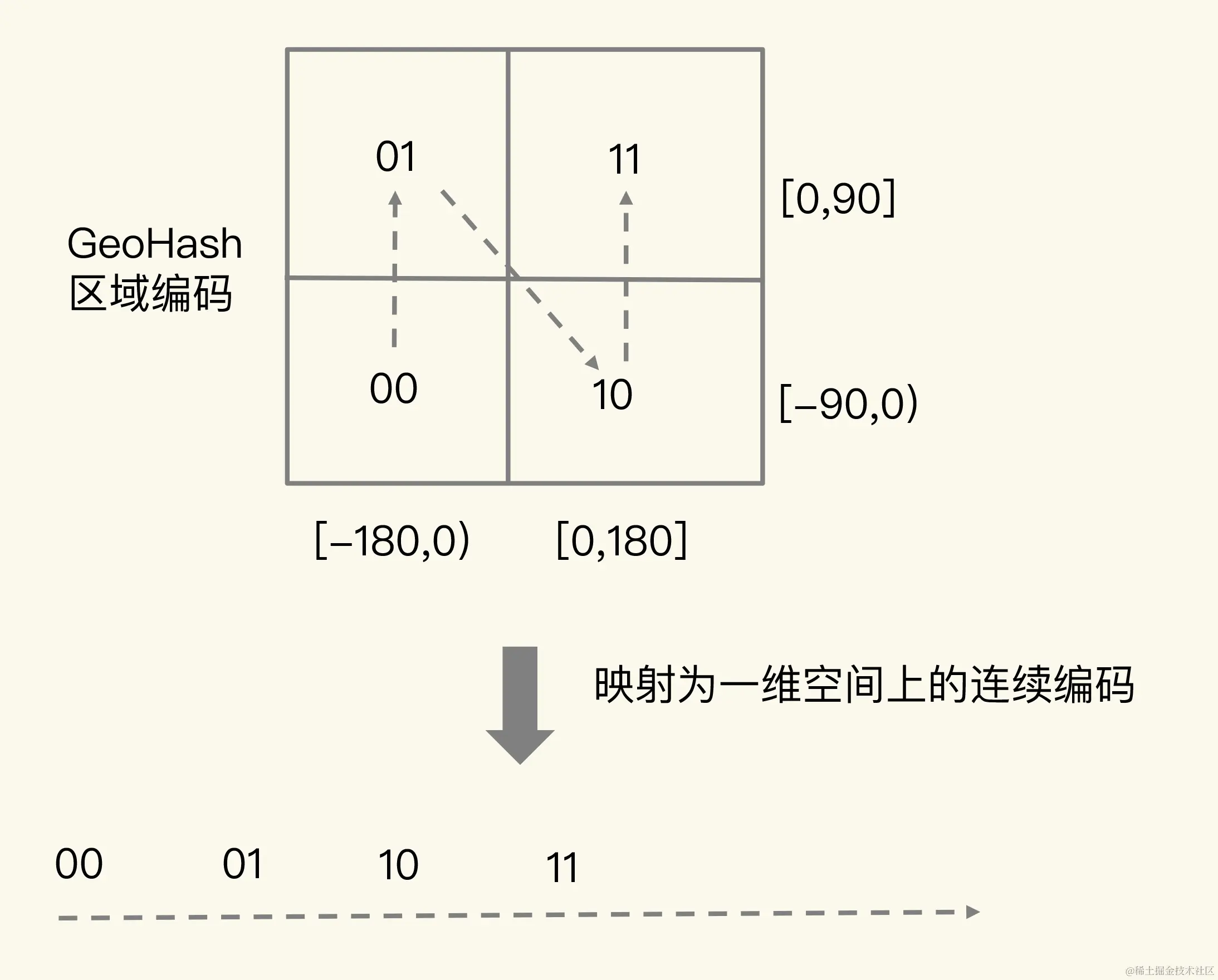 核心原理:当我们要对一组经纬度进行 GeoHash 编码时,我们要先对经度和纬度分别编码,然后再把经纬度各自的编码组合成一个最终编码