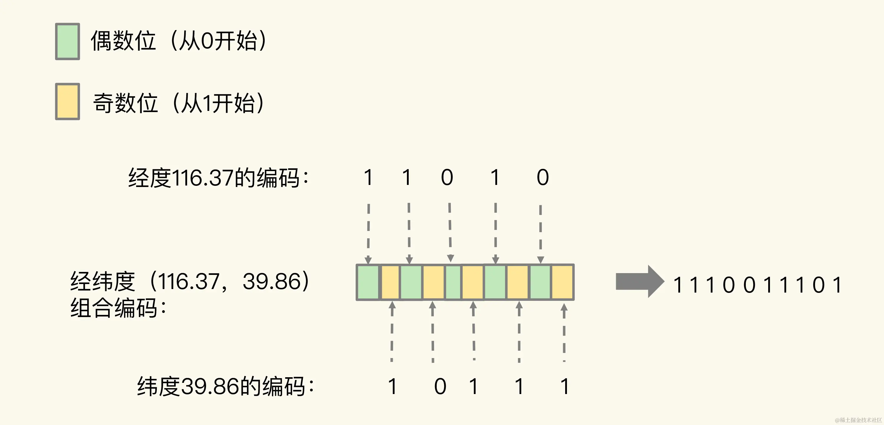 组合规则:最终编码值的偶数位上依次是经度的编码值,奇数位上依次是纬度的编码值(2N位)1110011101
