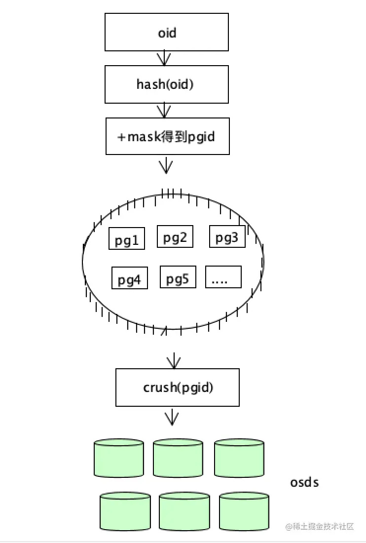 hash(oid)值加上一个掩码得到一个pgid