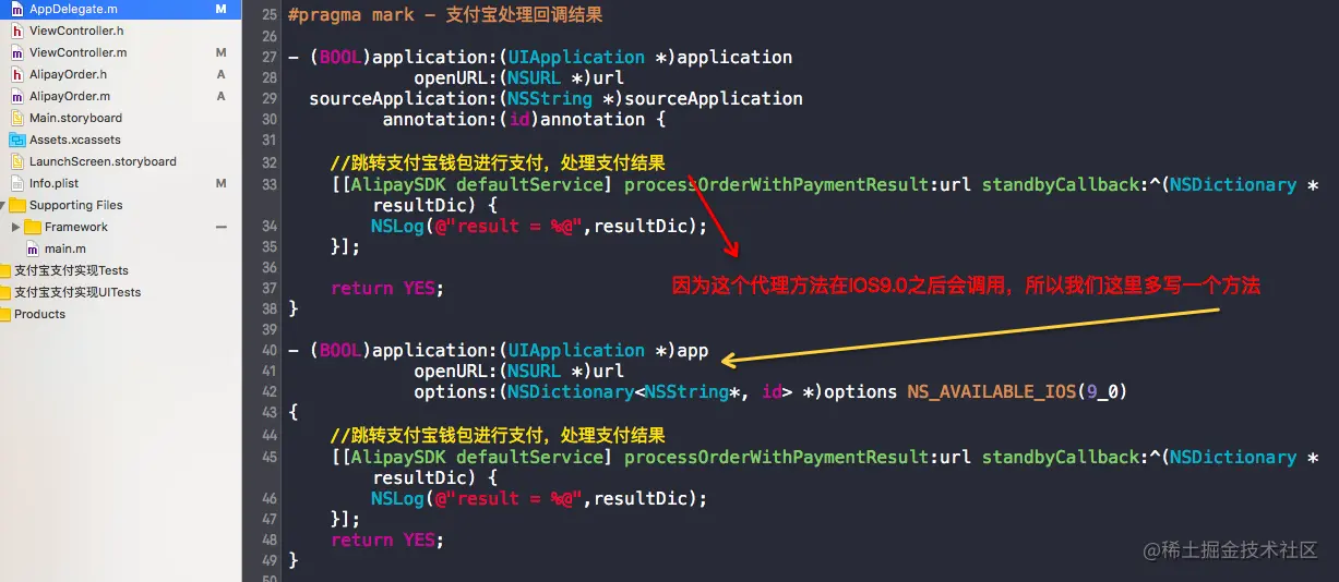 2-9、支付代码处理之后,我们处理回调结果,我们需要在Appdelegate中添加支付宝头文件#import <AlipaySDK/AlipaySDK.h>并添加处理回到结果的代理方法: